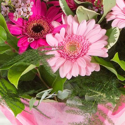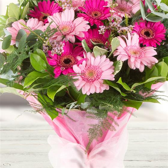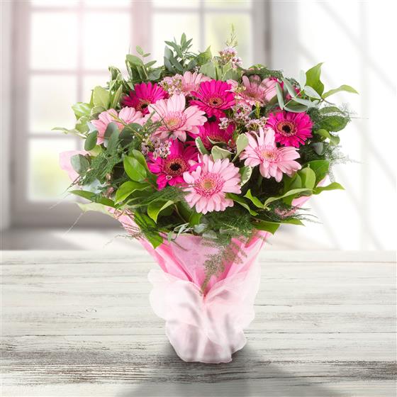A hand-tied bouquet of cerise and baby pink gerberas accompanied by a selection of mixed foliage.