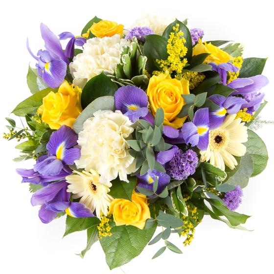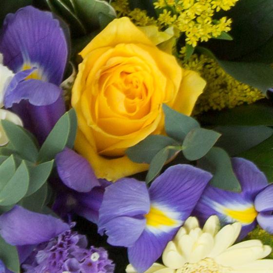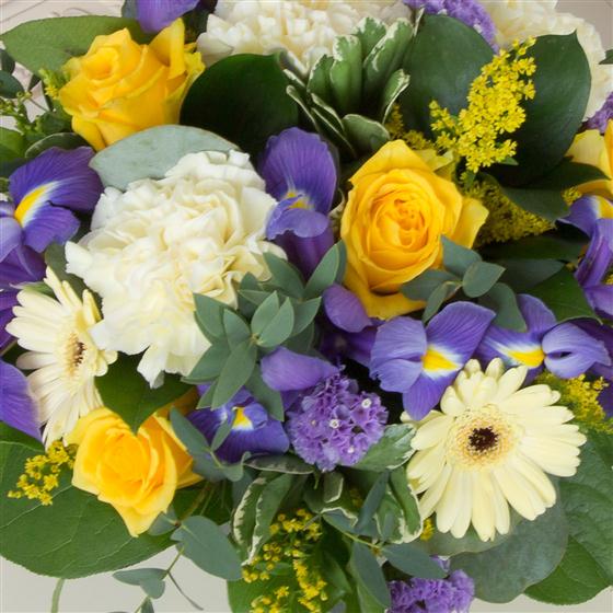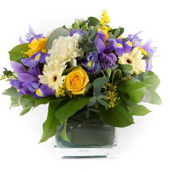 A compact, cube arrangement of golden yellow roses, lemon carnations, statice, iris and solidaster.