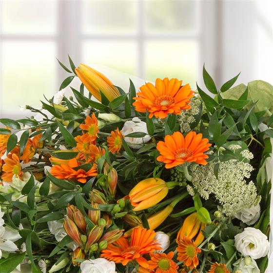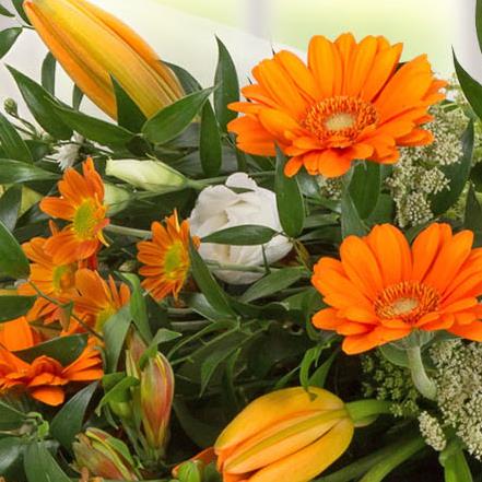 A striking selection of white and orange blooms including mini gerberas and lilies, presented as a traditional style bouquet.