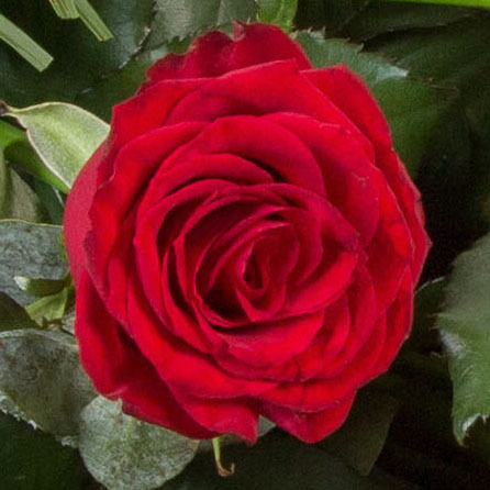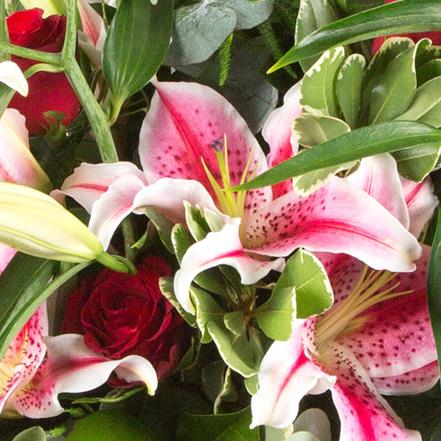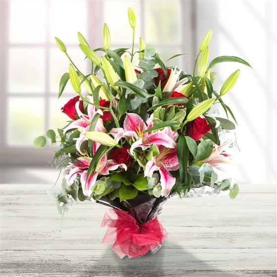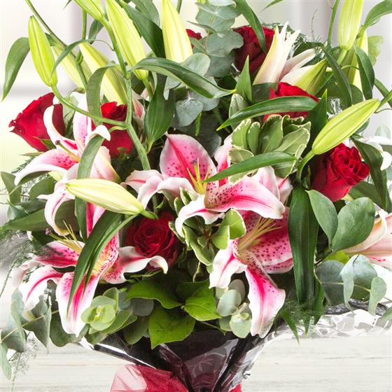 A highly scented, beautiful hand-tied bouquet of velvety red roses and stargazer lilies.