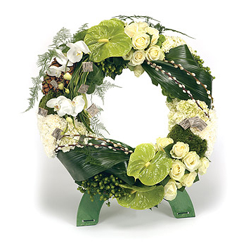 Circular wreath, in shades of white & cream, including Roses, Anthuriums, Orchids, Carnations and complementary foliage. Size: Diameter - 62cm (24").